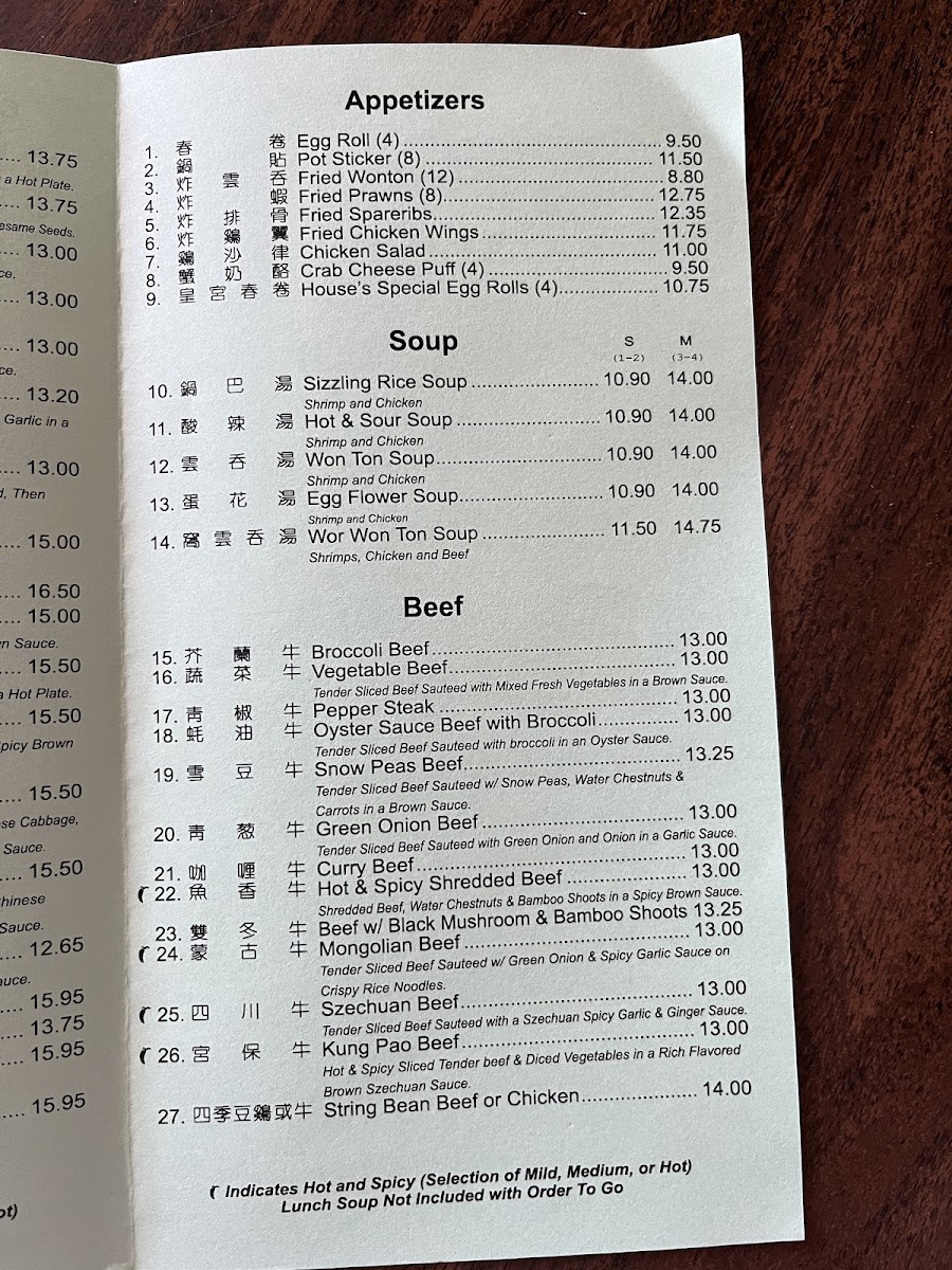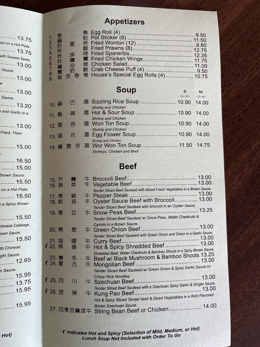 - Soups: Start with delightful offerings like the Wor Wonton Soup and the Hot & Sour Soup, priced around $12.90 to $13.50.