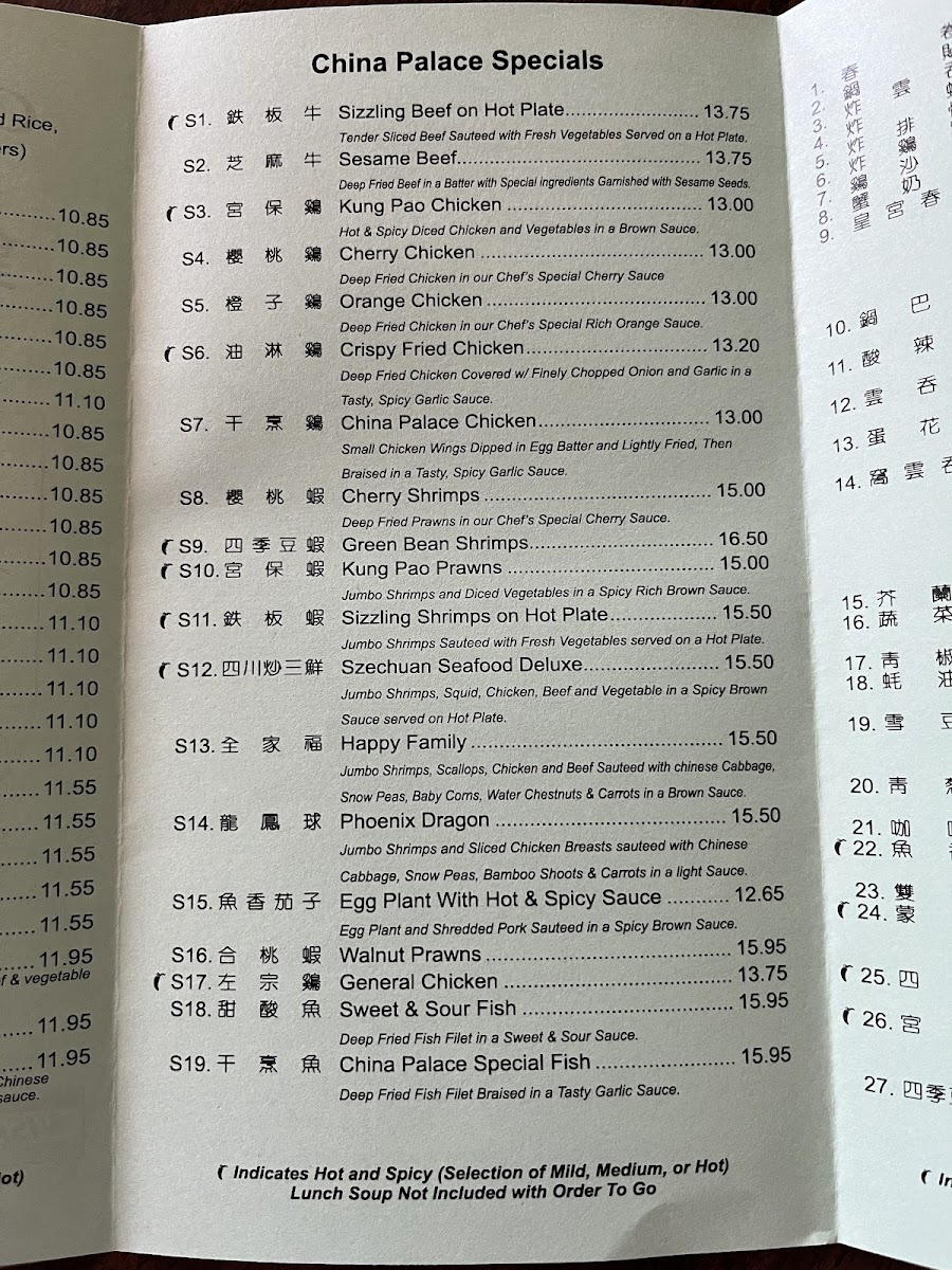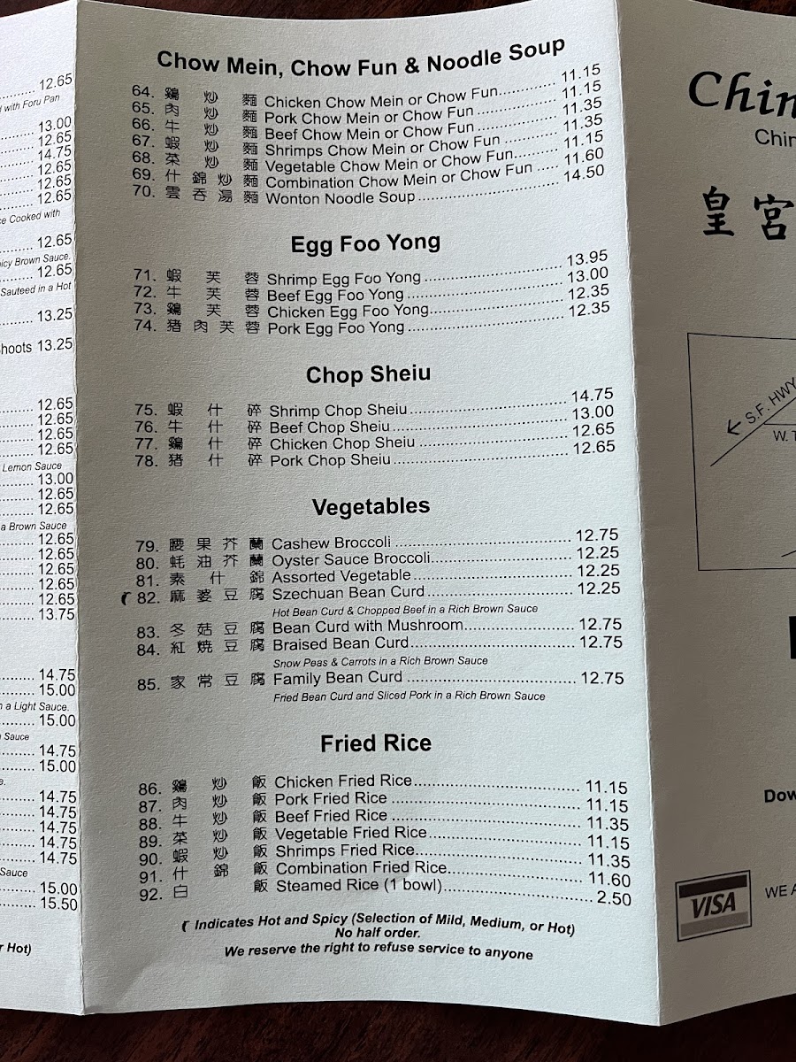 - Chow Mein & Chow Fun: Enjoy flavorful dishes such as Shrimp Chow Mein and Vegetable Chow Fun, all for about $13.15 to $13.35.